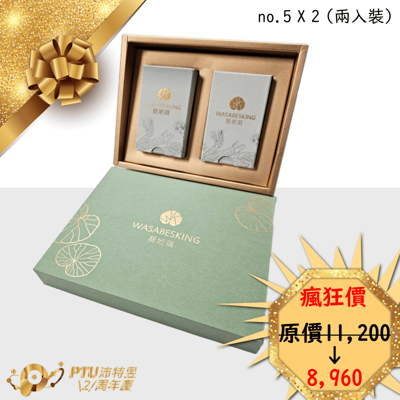 - 組合內容:葵地淇WASABESKING 五號 x 2瓶 (含手工燙金包裝禮盒)